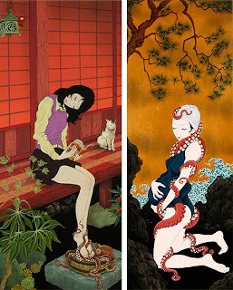 de entre toda esta parafernalia fantasmal mis favoritos son los tsukumogami, objetos cotidianos ―como una tetera, unas sandalias de paja o un tarro― que tienen más de cien años. Según la tradición, en el momento que cumplen cien años los objetos comienzan a adquirir una especie de vida animada o sobrenatural, comportándose con los humanos en función del trato que hayan recibido durante todo el tiempo que estuvieran inanimados. Según su forma y su función el espíritu cobra distinta apariencia, y recibe un nombre diferente. Por poner un ejemplo, los paraguas viejos se reaniman como karakasakozou, al paraguas le crecen dos brazos, un ojo y una larga lengua, y empieza a moverse saltando sobre el mango como si fuera una pierna.